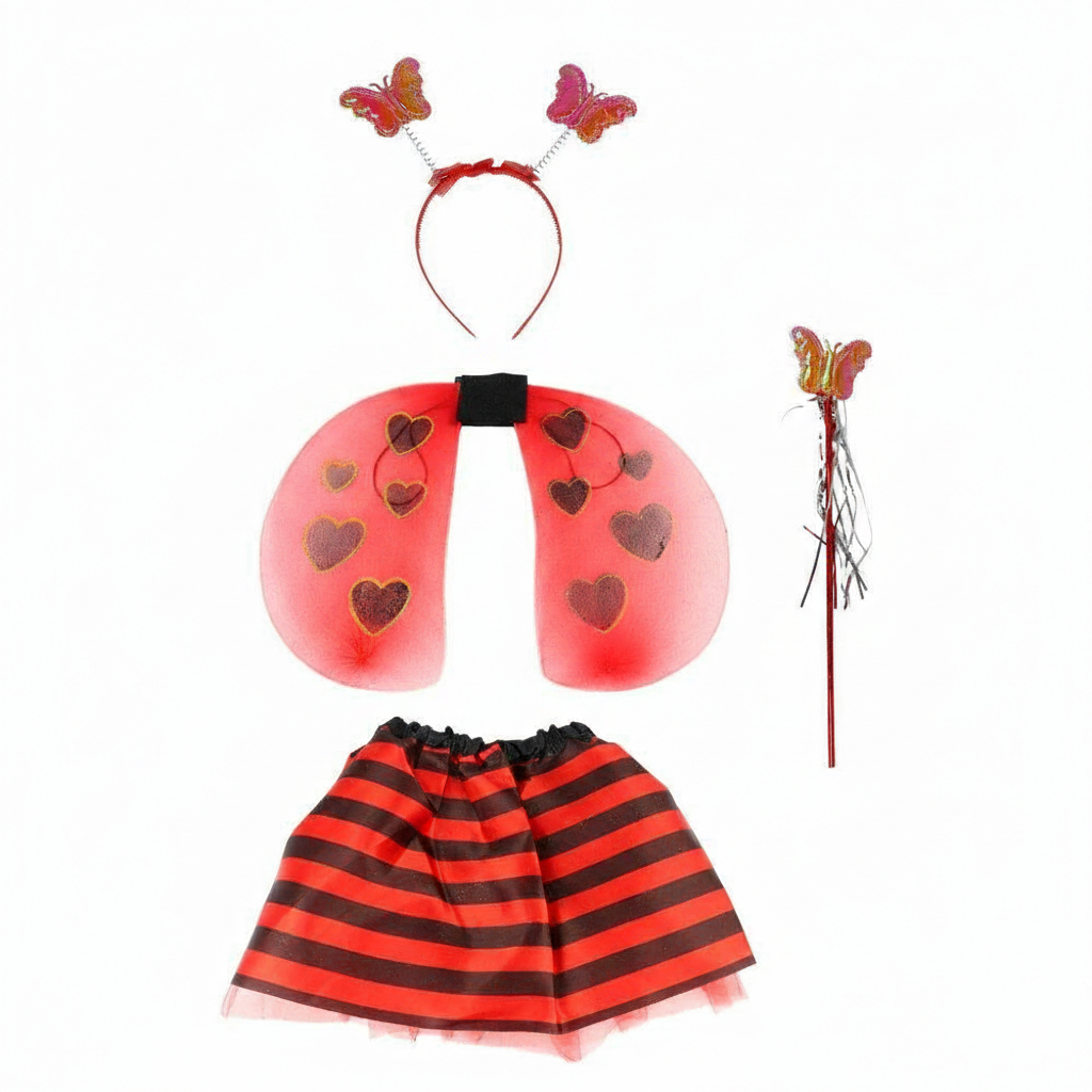 A fantasia inclui asas delicadas e coloridas, adornadas com glitter e pequenos corações nas extremidades, trazendo um toque romântico e encantador ao visual. As asas possuem um design gracioso que imita o formato de uma joaninha, criando um efeito visual único. A saia, com listras pretas e vermelhas, complementa o look com um toque de estilo e leveza, criando um visual perfeito para dançar e se divertir.