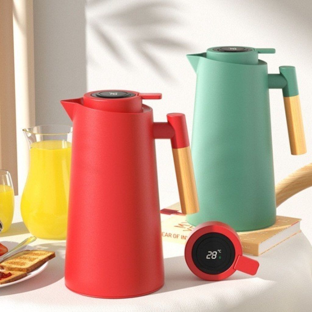 Garrafa Térmica Termometro Digital 1L Café Chá Nórdica Com Cabo Madeira