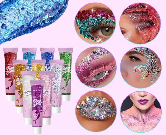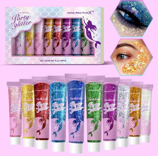 Dê um toque de brilho e fantasia ao seu visual com o kit de glitter gel da MISS FACTOR, ideal para aplicação no rosto e corpo. Com uma estética inspirada no universo das sereias, o conjunto traz 10 tubos com glitter em gel, perfeitos para festas, festivais, eventos temáticos ou qualquer ocasião em que você queira se destacar.